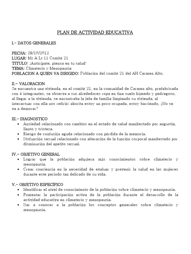 Plan De Actividad Educativa Pdf Menopausia Ciencias De La Salud