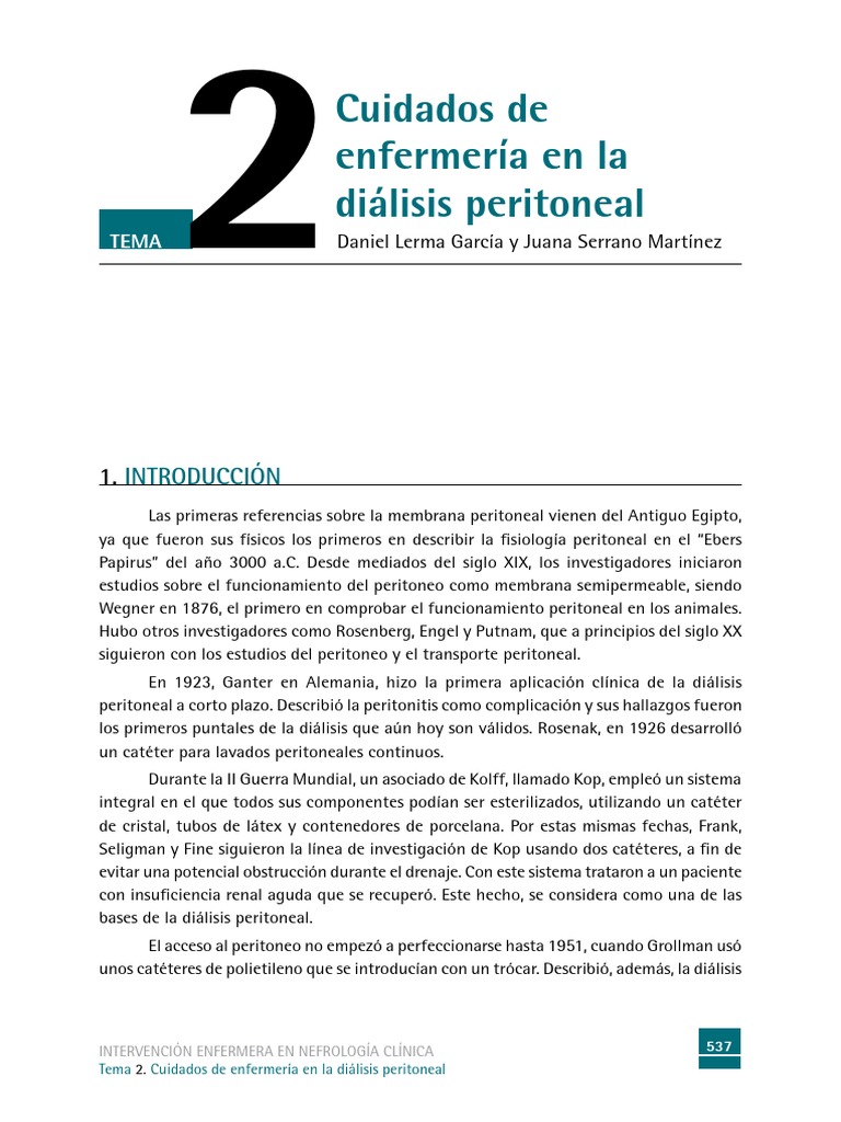 HISTORIA En 1964 Pálmer y Quinton diseñaron el primer catéter para diálisis peritoneal de Silicona Silastic para el tratamiento de pacientes con IRC que era un tubo redondo con un orificio amplio y numerosos pequeños en la porción terminal intraperitoneal que posteriormente perfeccionaría TENCKHOFF En 1968 con la llegada del catéter de Henry. Los cuidados de enfermería durante la diálisis peritoneal son de vital importancia dado que sus complicaciones pueden llegar a ser de gran envergadura e incluso letales. 3660 Cuidados de las heridas. Juan José Suárez Sánchez Firma. Teniendo en cuenta los conceptos teóricos de Dorotea Orem aplicados en el cuidado de enfermería en el paciente de Dialisis Peritoneal se logró resultados óptimos en el.