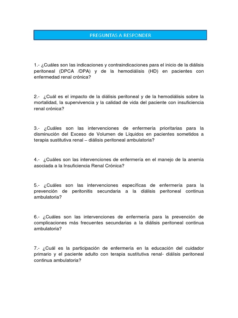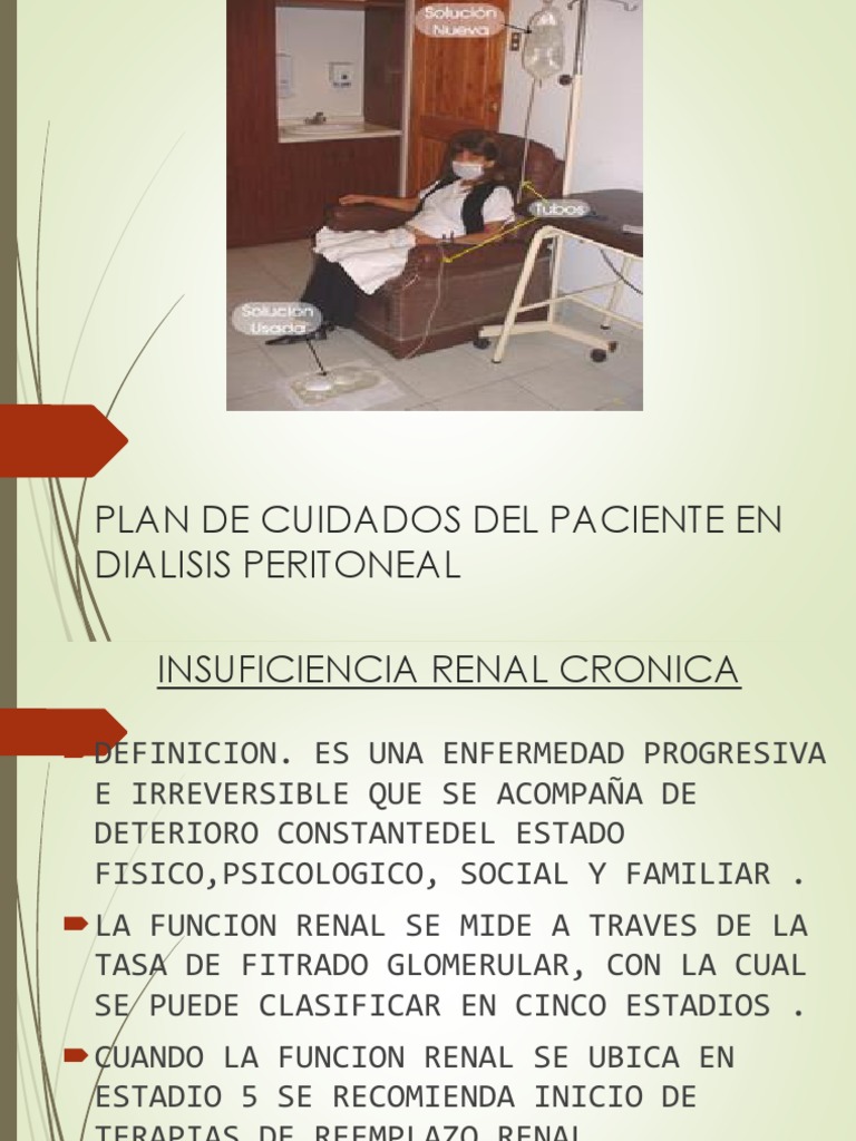 Creatinina TEP nPCR medición FRR pérdidas de proteínas y absorción de glucosa a las 4-8 semanas de iniciado el tratamiento DP. Perinatología y reProducción Humana Artículo de revisión Abril-Junio 2010 Volumen 24 Número 2 pp 131-139. Plan de cuidados de enfermerÍa para la atenciÓn del paciente con diÁlisis peritoneal diagnostico de enfermeria resultados de enfermeria clasificaciÓn de los resultados de enfermeria noc patron. 54 Plan de cuidados de enfermería en paciente pediátrico con IRC y uso de diálisis peritoneal. En el trabajo describimos los recursos con que contamos y la periodicidad de las intervenciones de enfermería que han sido estandarizadas y protocolizadas.
