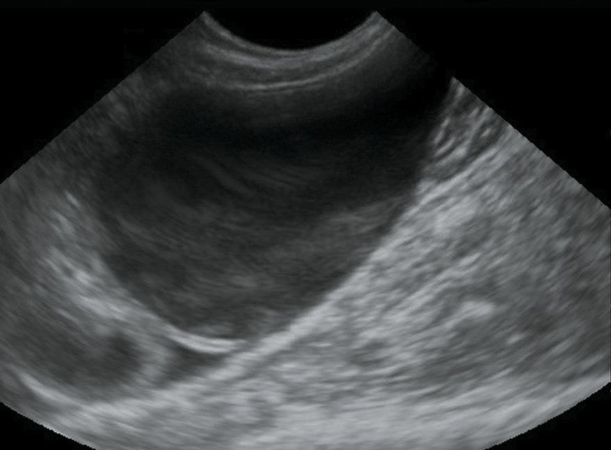 Las imágenes en blanco y negro muestran las estructuras internas de la pelvis como la vejiga y en las niñas los ovarios el útero el cuello del útero o cérvix y las trompas de Falopio. Es posible que le pidan que beba algunos vasos de agua para llenar la vejiga. Si la vejiga se encuentra llena ayuda a visualizar el útero los ovarios la pared de la vejiga y la próstata para el ultrasonido transabdominal. Difícil de valorar porque se producen reverberacio-nes entre la piel y el transductorê 28A veces el colon presiona la vejiga y distorsiona su contorno pudiendo ser confundido con una masa intramu-ralI. A continuación se repite la ecografía para medir la orina residual que queda en la vejiga después de la micción.